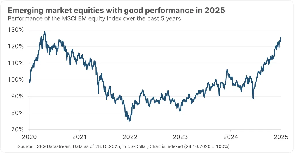 Navzdory politickým nejistotám a zpřísněné americké celní politice se obávané negativní dopady na rozvíjející se trhy zatím neprojevily. Přestože se v současnosti očekává, že růst na globálních rozvíjejících se trzích bude v roce 2026 nižší než v letošním roce, lze tento trend stále označit za jednoznačně pozitivní.