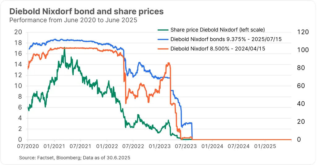 Graf níže ukazuje cenu akcie a ceny dvou dluhopisů společnosti Diebold Nixdorf, výrobce bankomatů a POS systémů, která se po roce 2022 dostala do finančních potíží. Zatímco zajištěný dluhopis si vedl relativně dobře díky kolaterálu, seniorní nezajištěný dluhopis prudce propadl, jak rostly obavy z restrukturalizace. Firma nakonec prošla restrukturalizací v srpnu 2023. Zajištěné dluhopisy získaly přibližně 98 % nového vlastního kapitálu, nezajištěné dluhopisy obdržely jen minimální návratnost a akcionáři byli zcela vymazáni.
