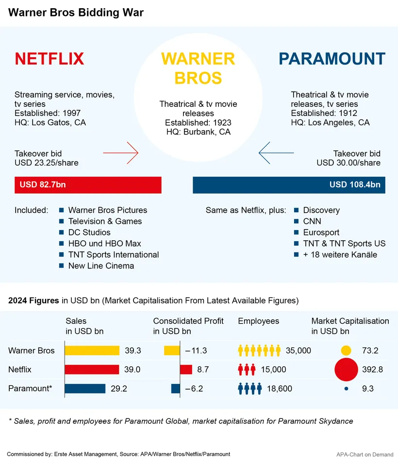 Paramount nabízí za celou skupinu Warner Bros. Discovery 108,4 miliardy USD v hotovosti. Netflix se přitom minulý týden s Warnerem dohodl na převzetí studia a streamovacích aktivit Warner Bros., avšak bez televizních kanálů, které jsou zatím stále součástí skupiny, jako je například CNN. Nabídka Netflixu se skládá z hotovosti a akcií.